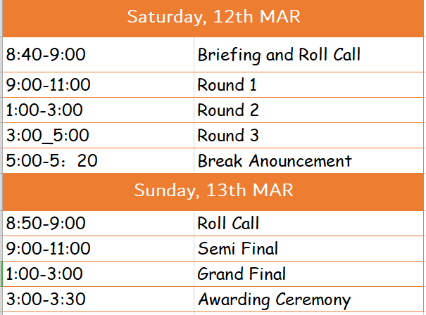 第1,2,3轮为积分赛,取该三轮总积分前八名的队伍,进入第二日的Semi Final;Semi Final中,取八支队伍中的前四名进入Grand Final。