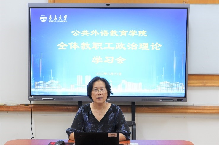 刘海荣主持政治理论学习,领学了8月25日《习近平给外文出版社的外国专家的回信》。教工党员代表徐淑丽老师做了《理解当代中国,培养新型外语人才》的党课分享。刘海荣进一步强调了师德师风和意识形态工作,提出具体要求。要求全体教职工坚持底线思维,落实立德树人根本任务。
