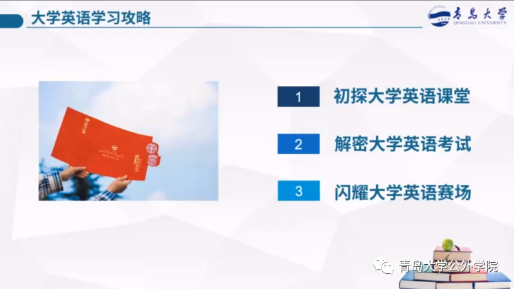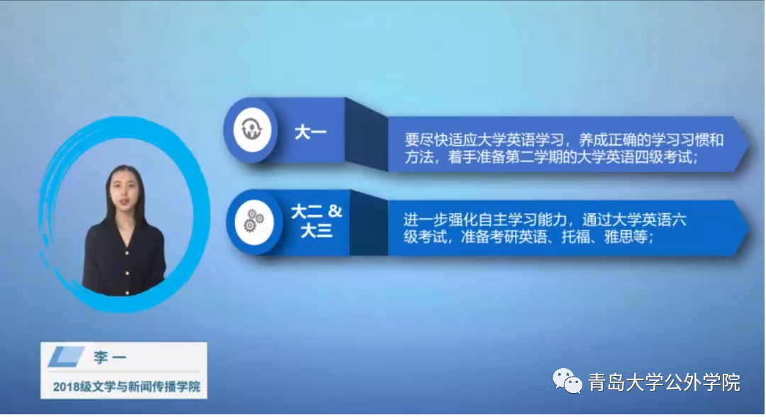 《大学英语学习攻略》坚持“以学为中心”,围绕学什么、怎么学,设计了课堂、考试和竞赛3个版块,时长共计约30分钟。攻略涵盖课程内容、考试介绍、竞赛准备、经验分享、资源推荐等,全方位、多角度畅谈英语学习,内容丰富,构思细致,让学生攻略在手,便拥有了贴心的英语学习顾问,未来四年英语学习的重要节点和规划设计一目了然。