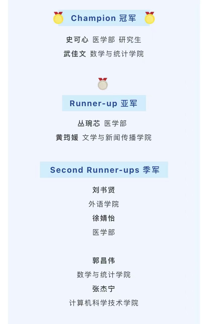主办的第24届“外研社·国才杯”全国大学生英语辩论赛青岛大学校园选拔赛圆满结束,来自医学部的史可心与来自数学与统计学院的武佳文组成的辩论队在比赛中脱颖而出,荣获冠军殊荣。