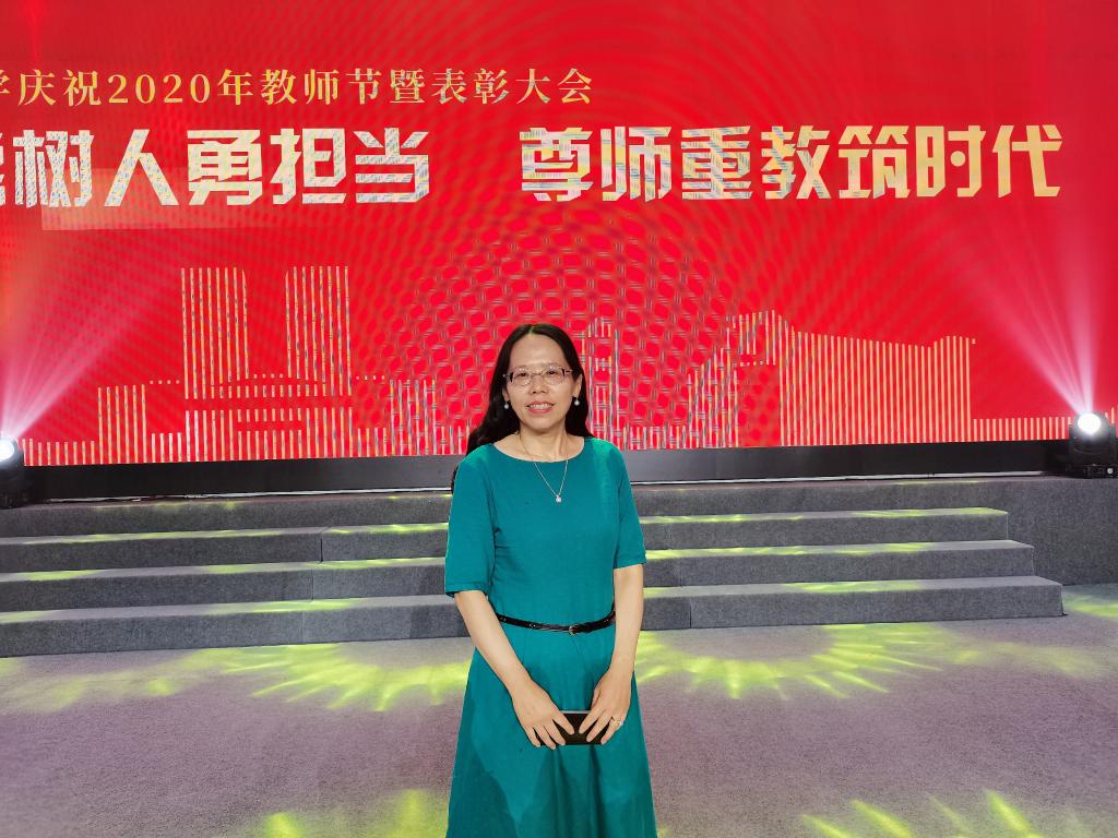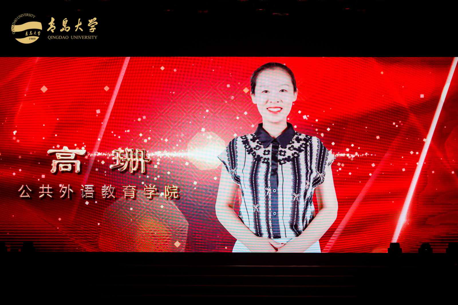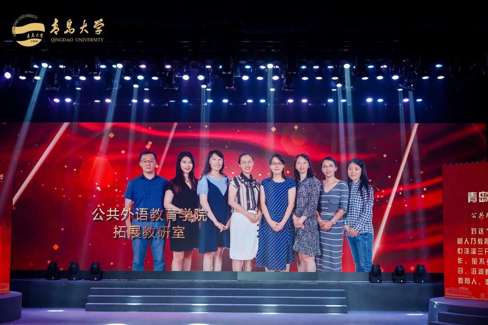 来庆彬老师荣获青岛大学“优秀教师”称号,高珊老师获青岛大学“教育先锋”表彰,拓展英语教研室集体荣膺青岛大学“教育先锋号”团队。高燕老师作为从教满30年教师代表上台,接受教师荣光纪念。