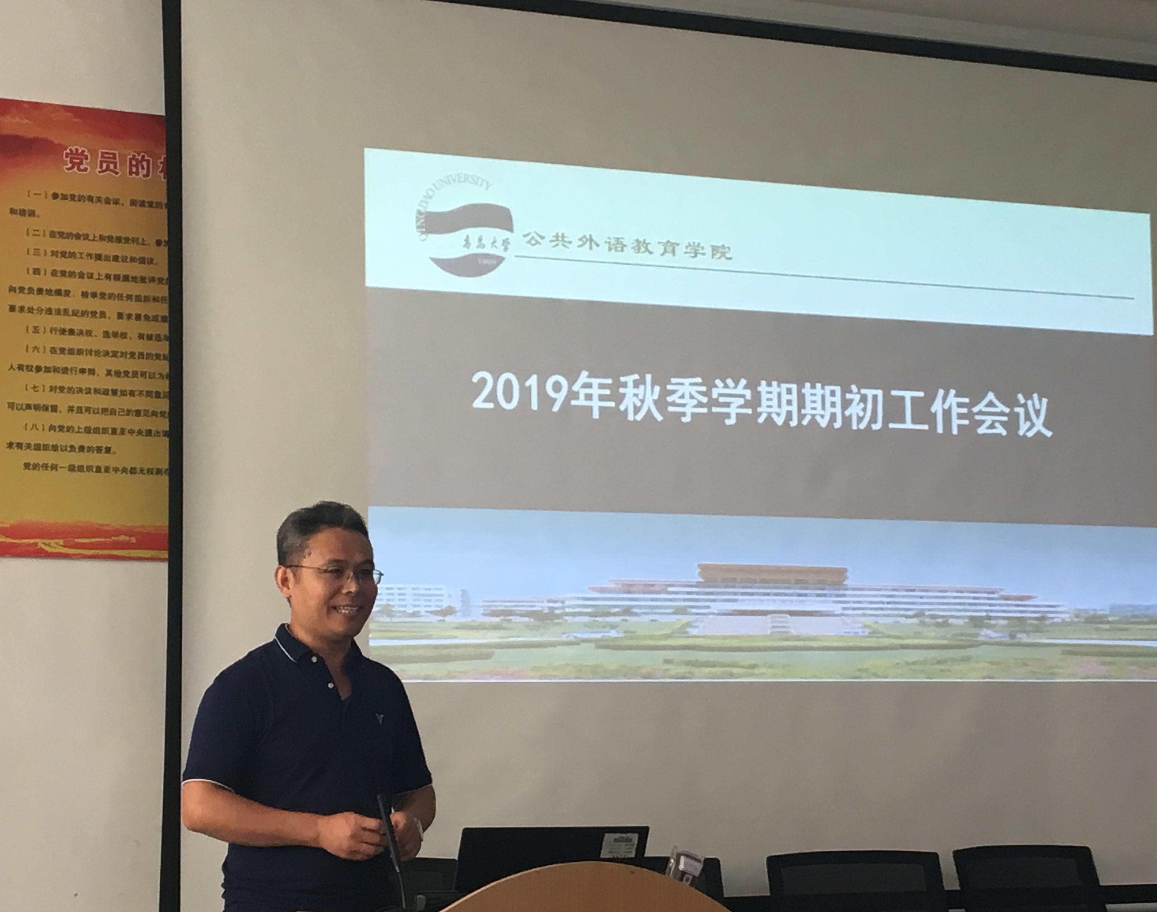 荣获外研社“教学之星”大赛全国半决赛一等奖的教师团队。围绕秋季学期的党建、教学等各项工作,国林祥做出周密部署。指出要扎实开展“不忘初心、牢记使命”主题教育,要继续开展“开放课堂”活动,组织开展大学生英语演讲比赛等各项英语竞赛,优化大学英语课程设置,大力进行课程建设,进一步完善大学英语精准教学服务和青大英语沙龙活动,切实做好我校的大学英语教学工作。