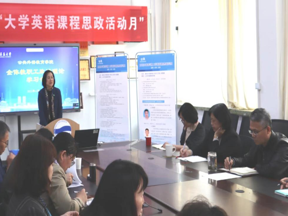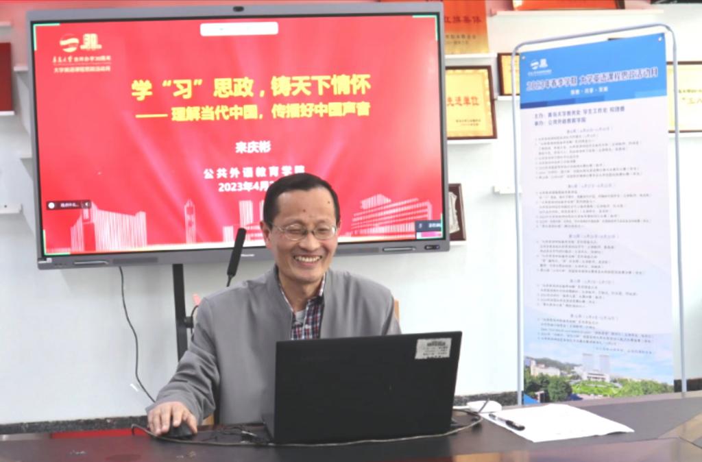 来庆彬副教授作了《学“习”思政,铸天下情怀——理解当代中国,传播好中国声音》的专题报告,学习了习近平总书记天下情怀的多样化系统化表述方式,帮助老师们提升中国传统文化素养,涵养天下情怀。院长国林祥强调“先达者为师”,鼓励老师加强学习,肩负立德树人的使命。