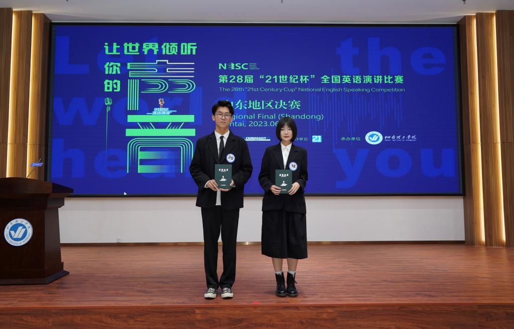 6月2日,第28届“21世纪杯”全国英语演讲比赛山东地区决赛在烟台圆满结束。我校外语学院德语系王筱彤同学、英语教育系于昊同学分获本次比赛一等奖和二等奖。王筱彤同学将代表山东省参加全国半决赛。