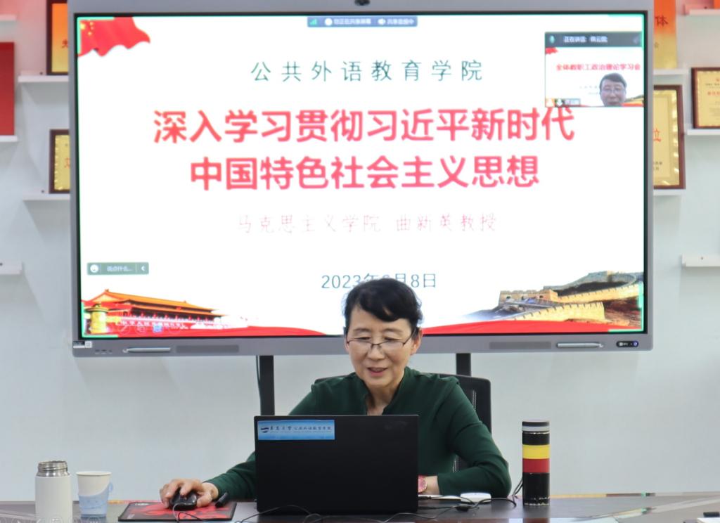 在睿思楼202会议室举办学习贯彻习近平新时代中国特色社会主义思想主题教育专题报告会。马克思主义学院曲新英教授作了专题报告。全院教职员工参加会议,会议由院党委书记刘海荣主持。