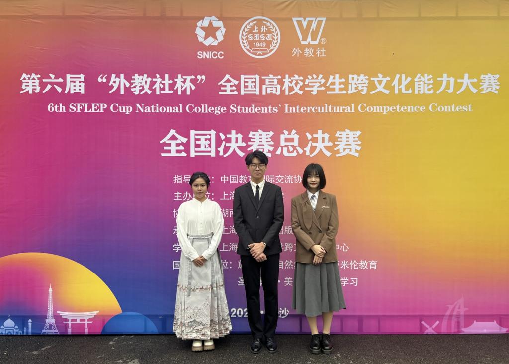 我校参赛团队积极备赛,以省赛第一名的成绩进入全国决赛,经过跨文化案例展析、即兴问答和跨文化名言名句解读三个环节的比拼,我校参赛团队展示了在跨文化理论知识与实践、国际视野、思辨能力、英语语言应用能力、演讲与沟通技巧等多方面的综合实力,获得了大赛评委的认可。