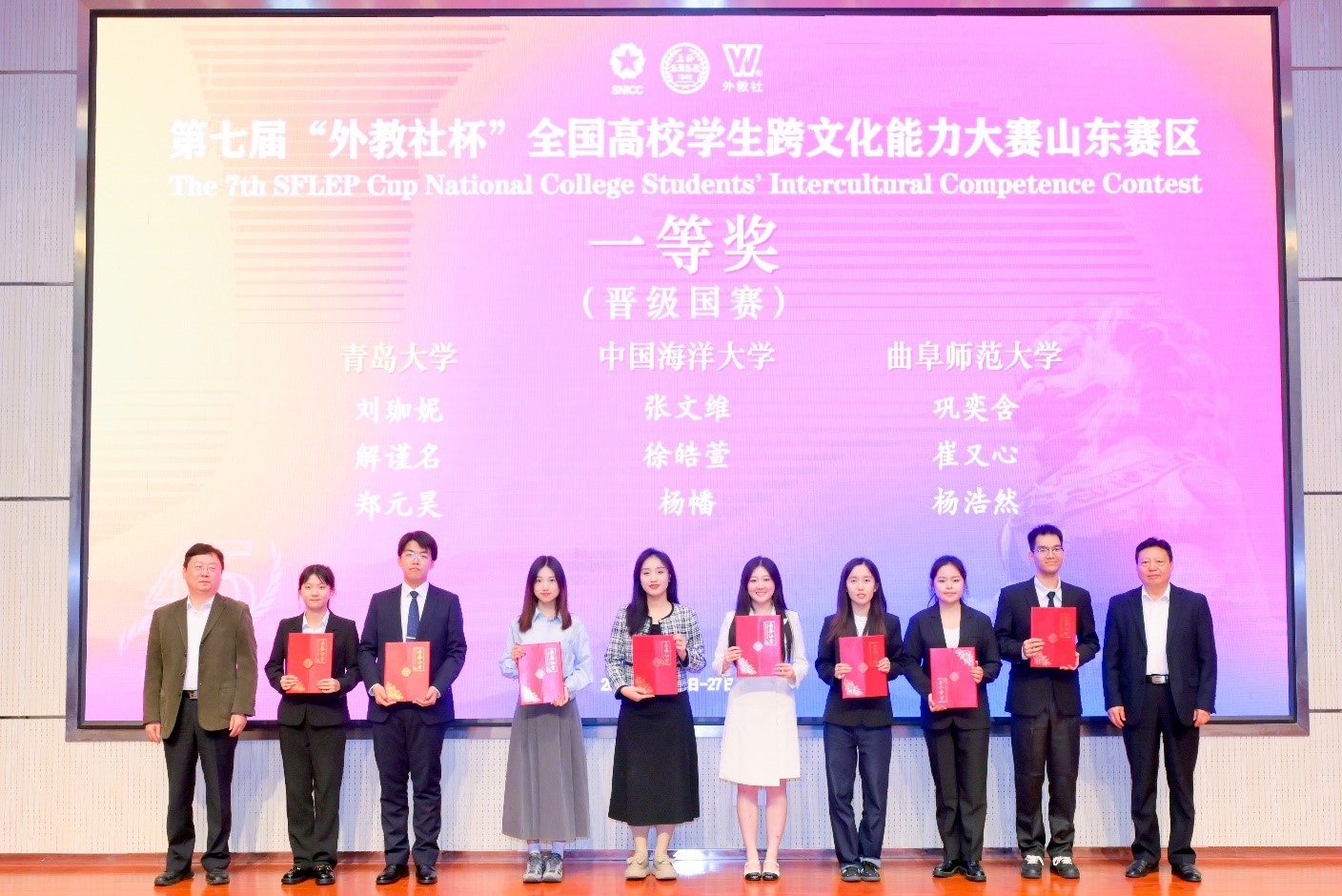 在赛后举行的颁奖典礼上,青岛大学党委常委、副校长陈涛、上海外语教育出版社副总编张宏分别代表山东赛区承办单位和全国组委会致辞。颁奖嘉宾为各获奖团队颁发了奖项。