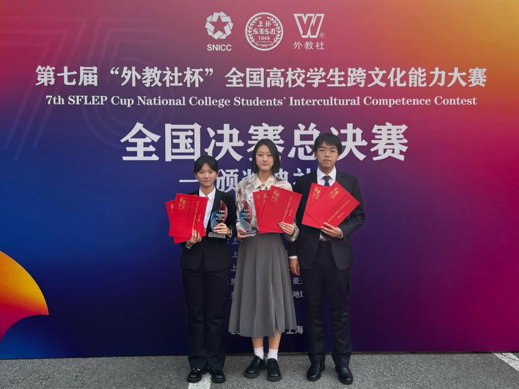 我校参赛团队积极备赛,努力拼搏,一路从校赛、省赛闯入全国决赛。决赛中,经过跨文化案例开发与展析、名言名句解读、知识问答、情景评述和讲述中国故事等多项环节的考察,我校参赛团队展示了在跨文化理论知识与实践、国际视野、思辨能力、英语语言应用能力、演讲与沟通技巧等多方面的综合实力,获得了大赛评委的高度认可,总决赛成绩名列全国第四,荣获全国一等奖,取得“外教社杯”全国高校学生跨文化能力大赛成绩的又一次重大突破。
