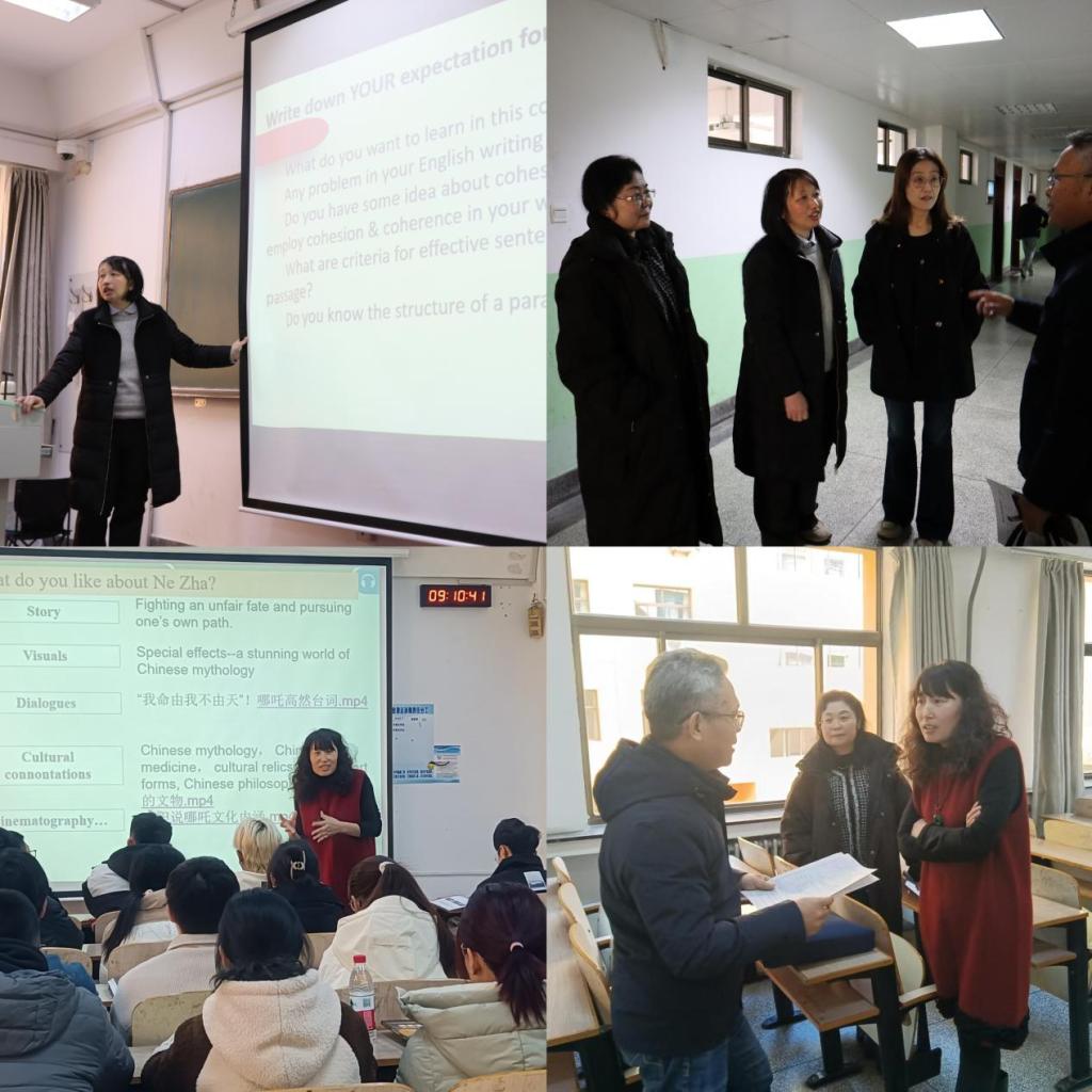 院领导一行来到浮山校区博远楼,听取了肖宁宁老师讲授的《高级英语写作》和苗祥玲老师主讲的《大学英语视听说》课程。课堂上,两位教师均提前到岗,教学准备充分,展现出扎实的专业素养和精湛的教学艺术。课程内容设计科学合理,既注重知识传授,又巧妙融入传统文化元素;课堂组织生动活泼,师生互动积极热烈,充分展现了新学期良好的教学风貌。课间,院领导与任课教师及学生亲切交流,深入了解教学实际情况,并就课程建设、教学方法等方面进行现场指导。