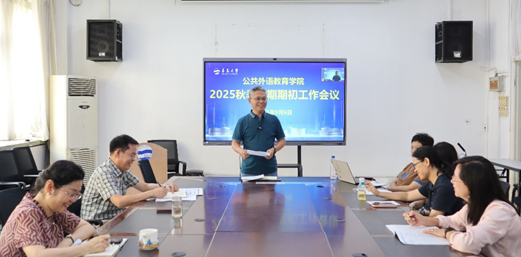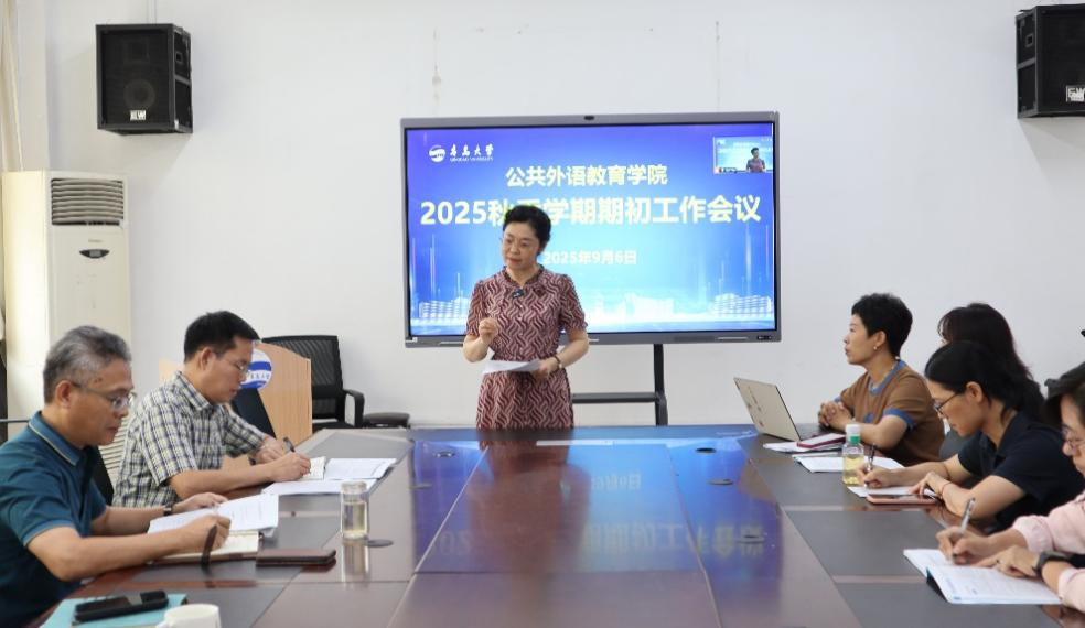 教师暑期以来的主要工作,指出暑期以来,学院教师积极参与,认真完成了研修、规培研究生教学、德雷克联合学院教学研讨、英语赛事组织指导、排课等各项重点工作。他对新学期进行了部署,要求各教研室、各教学团队认真做好备课研讨、开课、缓补考等各项期初工作。在新的学期,学院要继续开展“大学英语活动月”系列活动,组织开展各项高水平英语竞赛,优化大学英语课程设置,积极推进AI赋能大学教学改革,大力开展社会服务工作,高质量完成我校的大学英语教学工作。