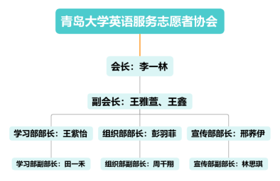 评委会一致同意推荐李一林同学担任新一届青岛大学英语服务志愿者协会会长,王雅萱、王鑫为协会副会长,王紫怡、彭羽菲、邢荞伊分别为协会学习部、宣传部和组织部部长。
