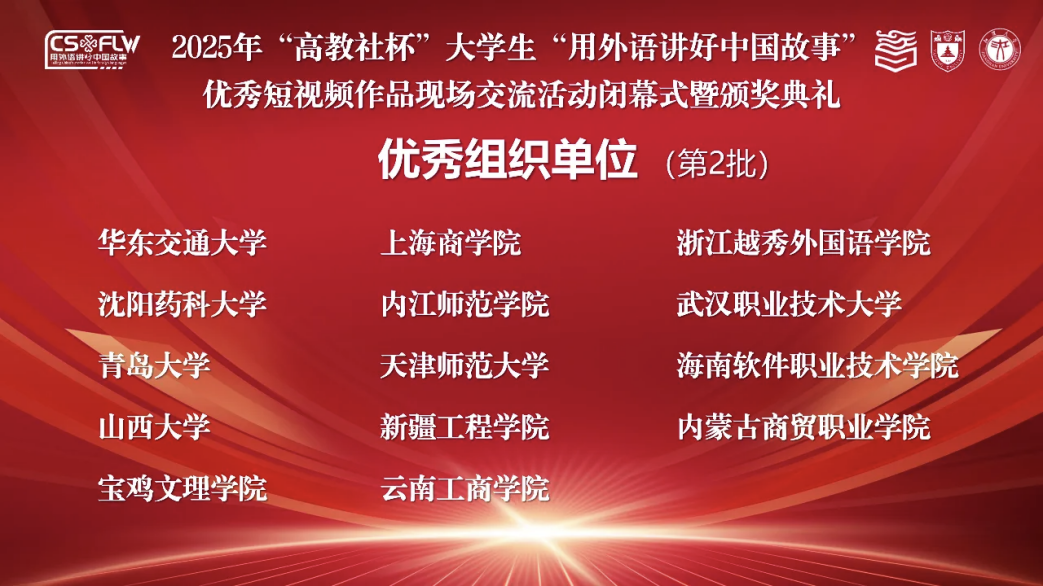 9月19-21日, 2025年“高教社杯”大学生“用外语讲好中国故事”优秀短视频现场交流活动在江汉大学举办。我校外语学院张佳奕团队获得全国一等奖,团队成员史新月代表团队参加了现场交流活动。我校获评优秀组织单位。