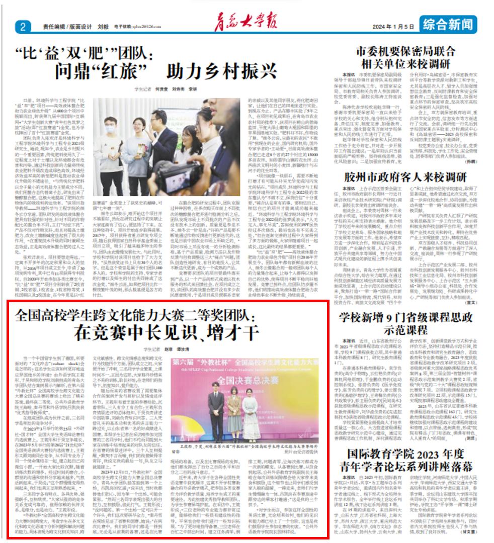 1月5日,《青岛大学报》以《全国高校学生跨文化能力大赛二等奖团队: 在竞赛中长见识、增才干》为题,报道了我校跨文化能力大赛团队。由外语学院王筱彤、于昊和师范学院刘萌组成的青岛大学团队在第六届“外教社杯”全国高校学生跨文化能力大赛全国总决赛中荣获全国二等奖。ag九游会官网