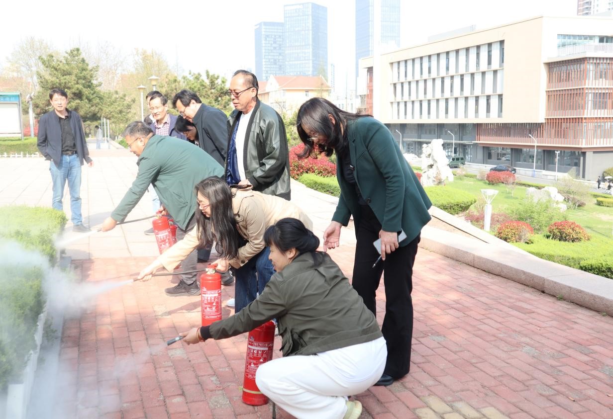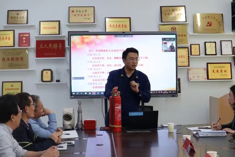 会议邀请崂山区消防救援大队宣教中心主任孙斌、学校安全管理处副处长武瑞斌、刘巧迪老师进行消防安全宣讲培训,讲解灭火、逃生等基本常识,并指导老师们操作使用灭火器材。