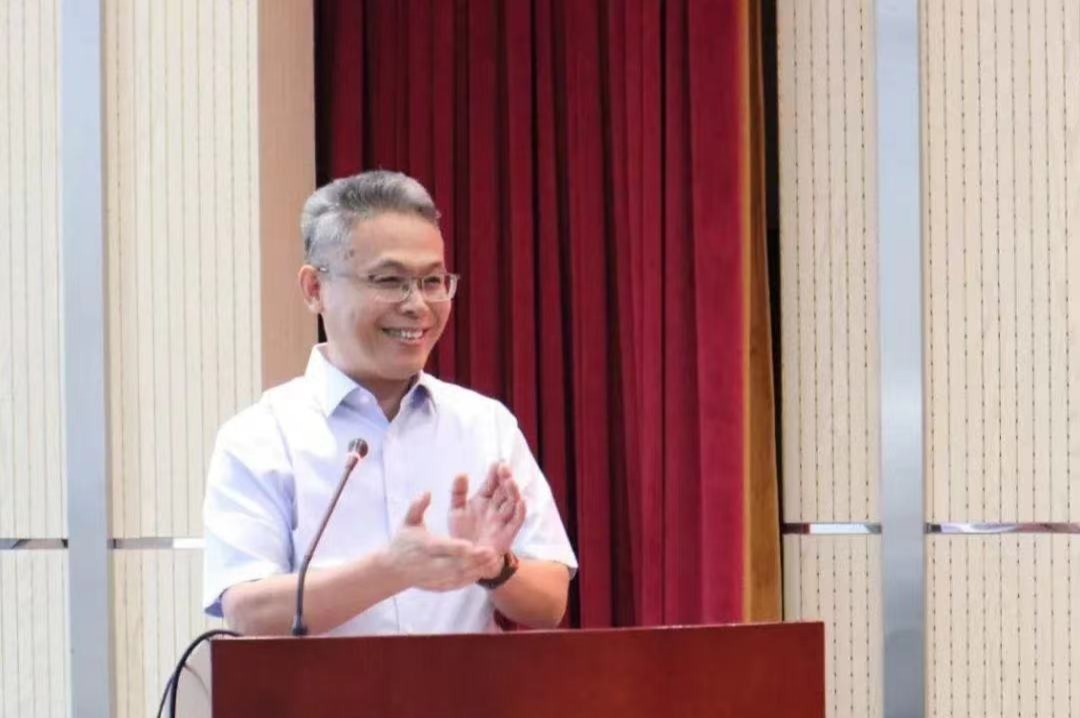 国林祥赛前致辞,阐述了比赛的重要性,提出比赛与时代精神同向共进,强调用外语“讲好中国故事,传播中国声音”是青大青年的神圣使命。
