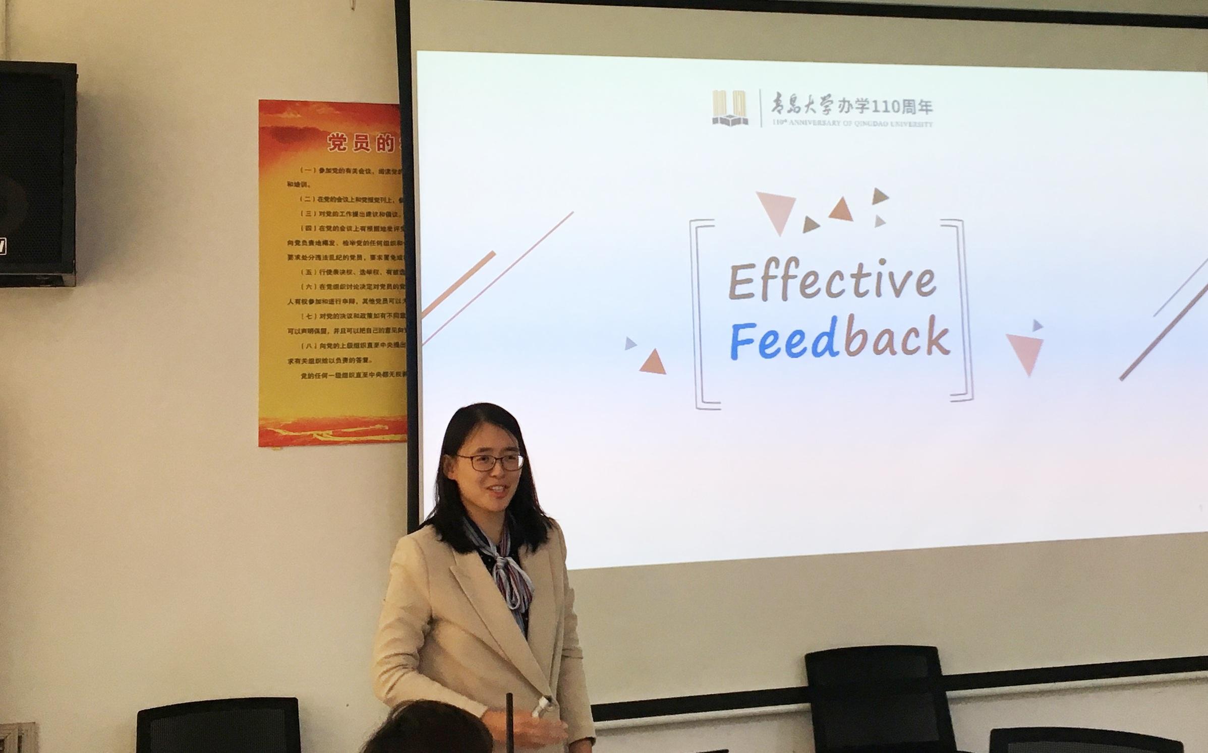 张恬随即分享了“如何对学生汇报展示进行有效的教师反馈”。她根据自己在演讲课上的教学实践,结合《视听说教程1》的特点,围绕如何使用讲稿、课堂展示的常见技巧以及课堂展示的反馈标准,解析了如何进行教师反馈。提纲写作训练会帮助学生提高逻辑思维能力。内容(content)、语言(language)和表达(delivery)是衡量口语展示质量的三个基本方面。学生在课堂展示时应做好以下6点:语言的使用、要点的组织方式、视觉辅助的使用、言语的表达、肢体语言以及对现场听众的影响效果。