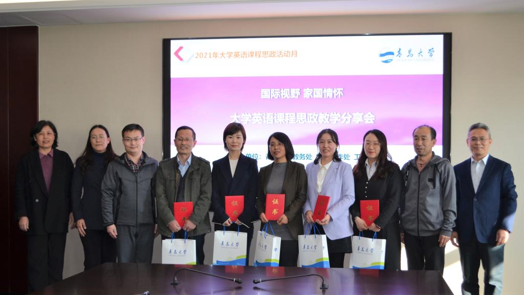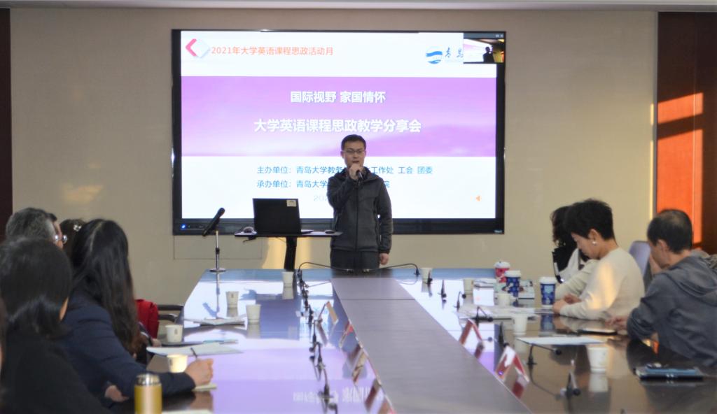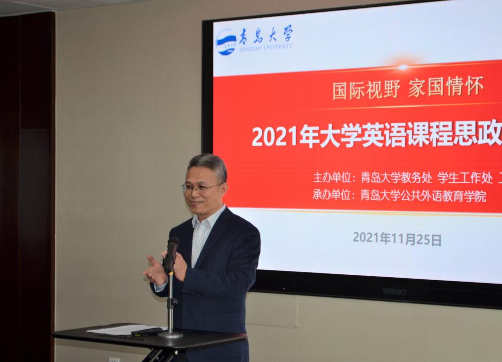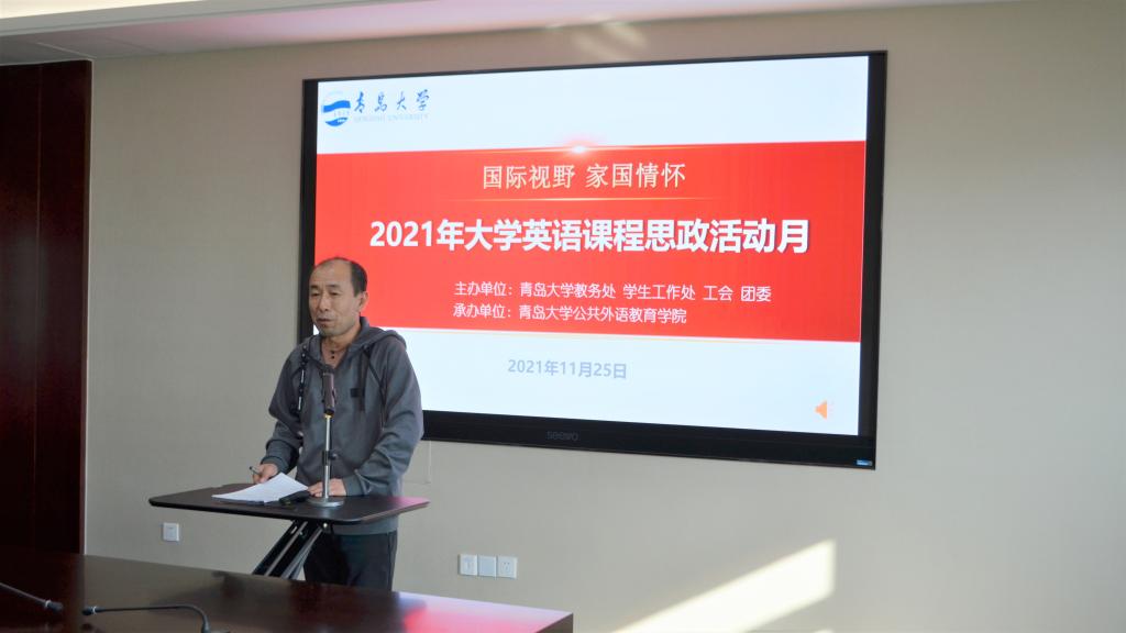 11月25日下午,2021年青岛大学“大学英语课程思政活动月”开幕式暨大学英语课程思政教学分享会在校会议中心302会议室举行,钉钉同步直播。校工会主席林忠平、教务处副处长马泽刚、院党委书记刘海荣、院长国林祥、副院长王海峻及教师代表出席现场活动。国林祥主持开幕式。