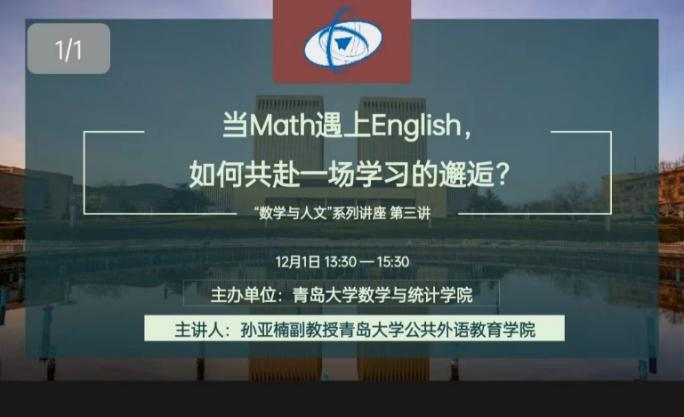 为培养多学科交叉融合型人才,增强学生人文素养,12月1日13:30,数学与统计学院“数学与人文”系列讲座第三讲——“当Math碰上English,如何共赴一场学习的邂逅”线上开讲。ag九游会官网
